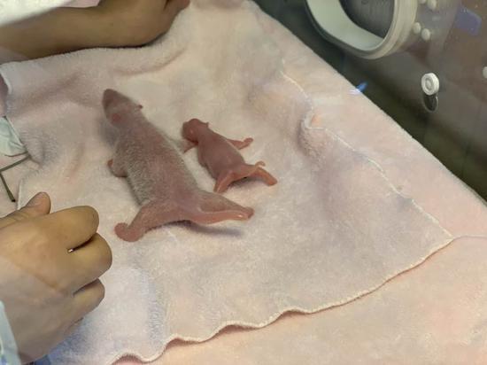 6月11日大熊貓“成大”產(chǎn)下的幼崽比“五一”還要輕幾克,他的體重現(xiàn)屬于極低、超輕。當這只幼崽出生時,在場的專家和飼養(yǎng)員又緊張又驚訝,因為她的體重僅為正常大熊貓幼崽的四分之一,體長還不到姐姐的三分之二。將雙胞胎兩姐妹放在一起,立即呈現(xiàn)萌體型差。目前,基地派出很強的育幼專家組對小仔進行24小時精心喂養(yǎng)和監(jiān)護。由于個體太小,其無法在媽媽那里吃到初乳,基地科研人員就想方設法從媽媽那里擠來初奶,為其人工補奶,并隨時監(jiān)測其呼吸、精神狀態(tài)、糞便等情況。盡管目前其生命體征比較平穩(wěn),但由于這種極低體重大熊貓幼崽存在很多不確定因素,基地的育幼專家和獸醫(yī)將應用多年來在育幼領域摸索中積累的豐富經(jīng)驗,希望能創(chuàng)造又一個生命的奇跡。